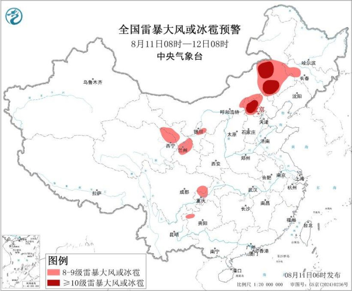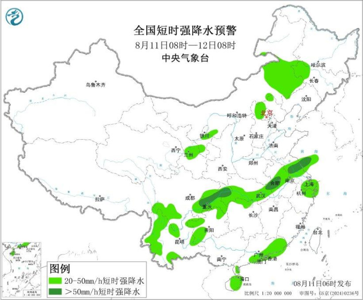 预计8月11日08时至12日08时,内蒙古东部、华北北部、西北地区东部、西南地区东部等地的部分地区将有8级以上雷暴大风或冰雹天气,其中,内蒙古东部、河北西北部等地的部分地区将有10级以上雷暴大风,最大风力可达11级以上;内蒙古东部、华北北部、西北地区东部、江淮、江汉、江南北部、西南地区东部、华南南部等地的部分地区将有小时雨量大于20毫米的短时强降水天气,其中,安徽中部、江苏中部、湖北西部、四川东南部、重庆中西部和东北部等地的部分地区小时雨量大于50毫米中岩投资,最大可达70毫米以上。
