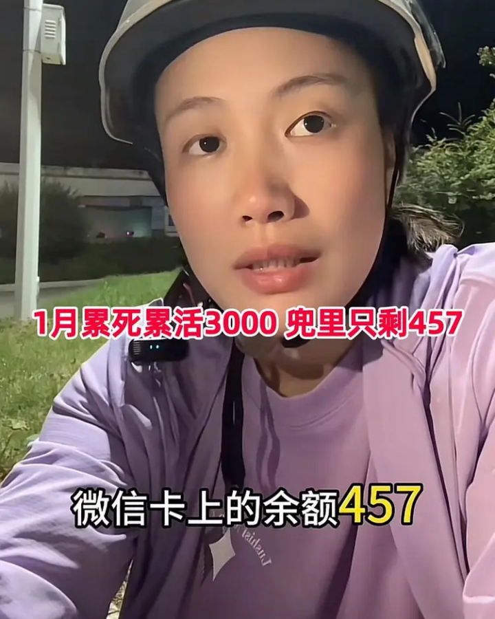女子吐槽自己顶着40度的高温,连续工作30天,到手工资3057元,给房东1000元,还债1000元,水电煤气500元,电话费100元,口袋只剩下457元,这便是自己一个月的生活费。