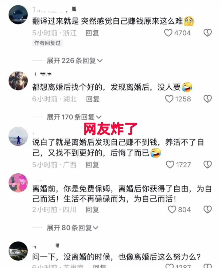 有网友:首先他后悔离婚并不是觉得自己错了,也不是念前夫的好。只是发现饭票没了。他30多没上班,对自己的工作能力应该是清楚的。无非是口嗨要娶他的男的不见了,人家只是想白嫖,结果她来真的。离婚后只能自己打工了。