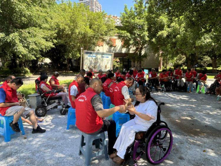 残疾人学员在户外学习并完成绳编作品。